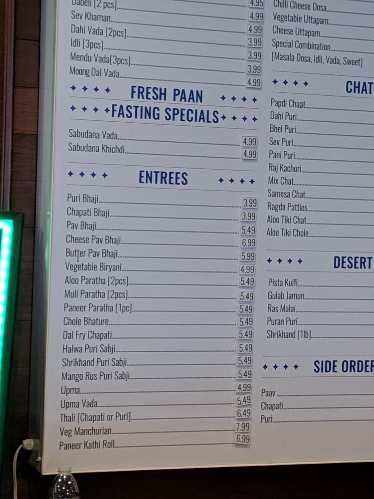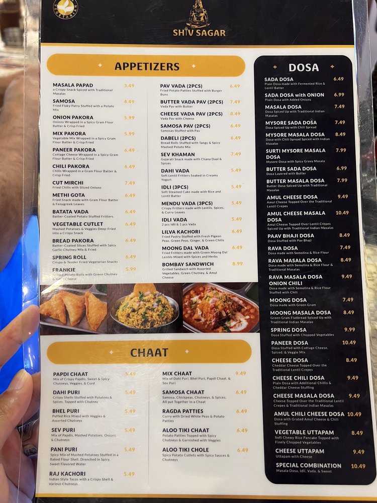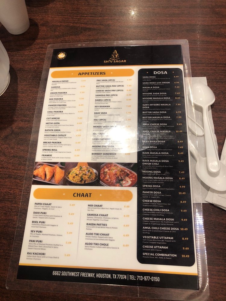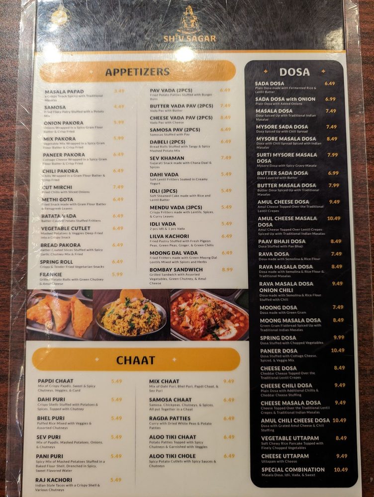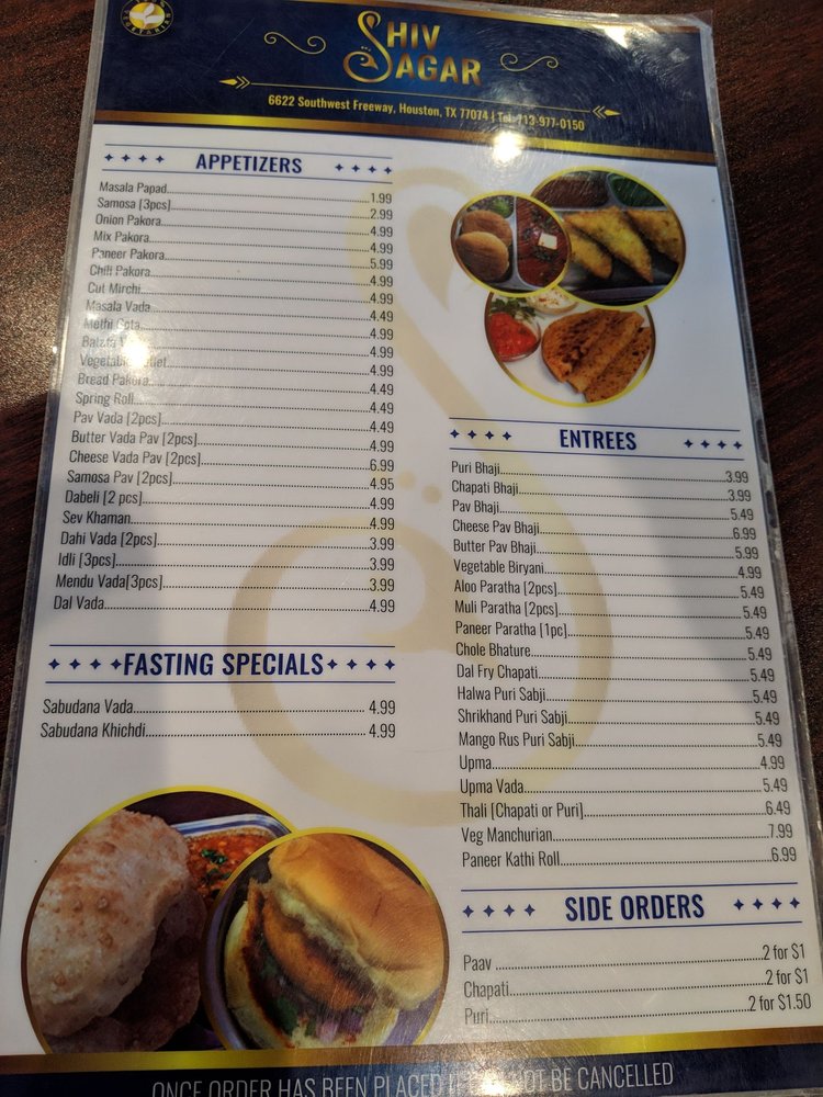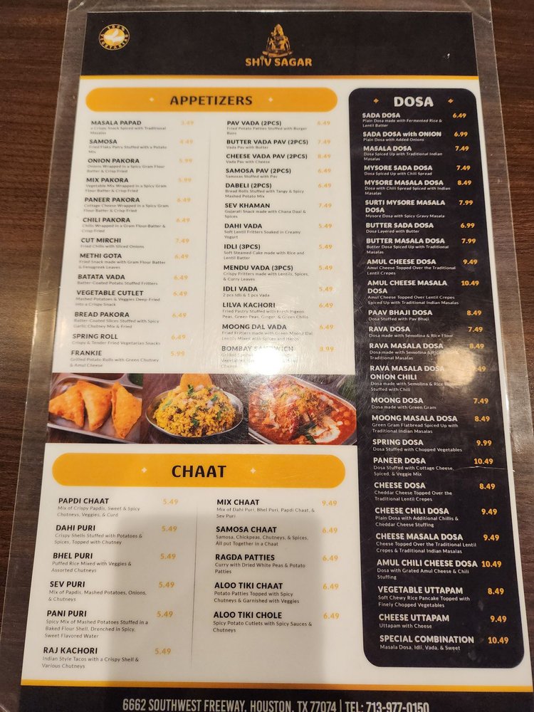 Shiv Sagar, a vegetarian Indian restaurant in Houston, TX, offers a diverse menu with vegan options, making it a go-to spot for vegans. The extensive beverage list includes traditional drinks like Chai Tea and Mango Lassi. Customers rave about the fast service, delicious food, and affordable prices. Popular appetizers like Masala Papad and Samosas showcase the authentic flavors of Indian cuisine. The Chaat section offers a variety of savory snacks like Dahi Puri and Bhel Puri. Customers appreciate the friendly staff and vibrant atmosphere at Shiv Sagar. Overall, the restaurant provides a great dining experience with a wide range of flavorful dishes to choose from. Don't miss out on their must-try dishes like Thali and Dosa when you visit Shiv Sagar.
